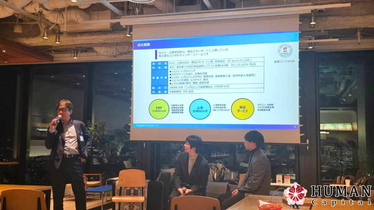 イベントでは、株式会社AIストームおよびAIアカデミーの取り組みが紹介され、今井社長からは、AIでは分からない、やる気のある人や挑戦したいと努力する人に出会いたいという思いも語られ、大学生から若手・ベテラン経営者まで、幅広い参加者が興味深く耳を傾けていました。